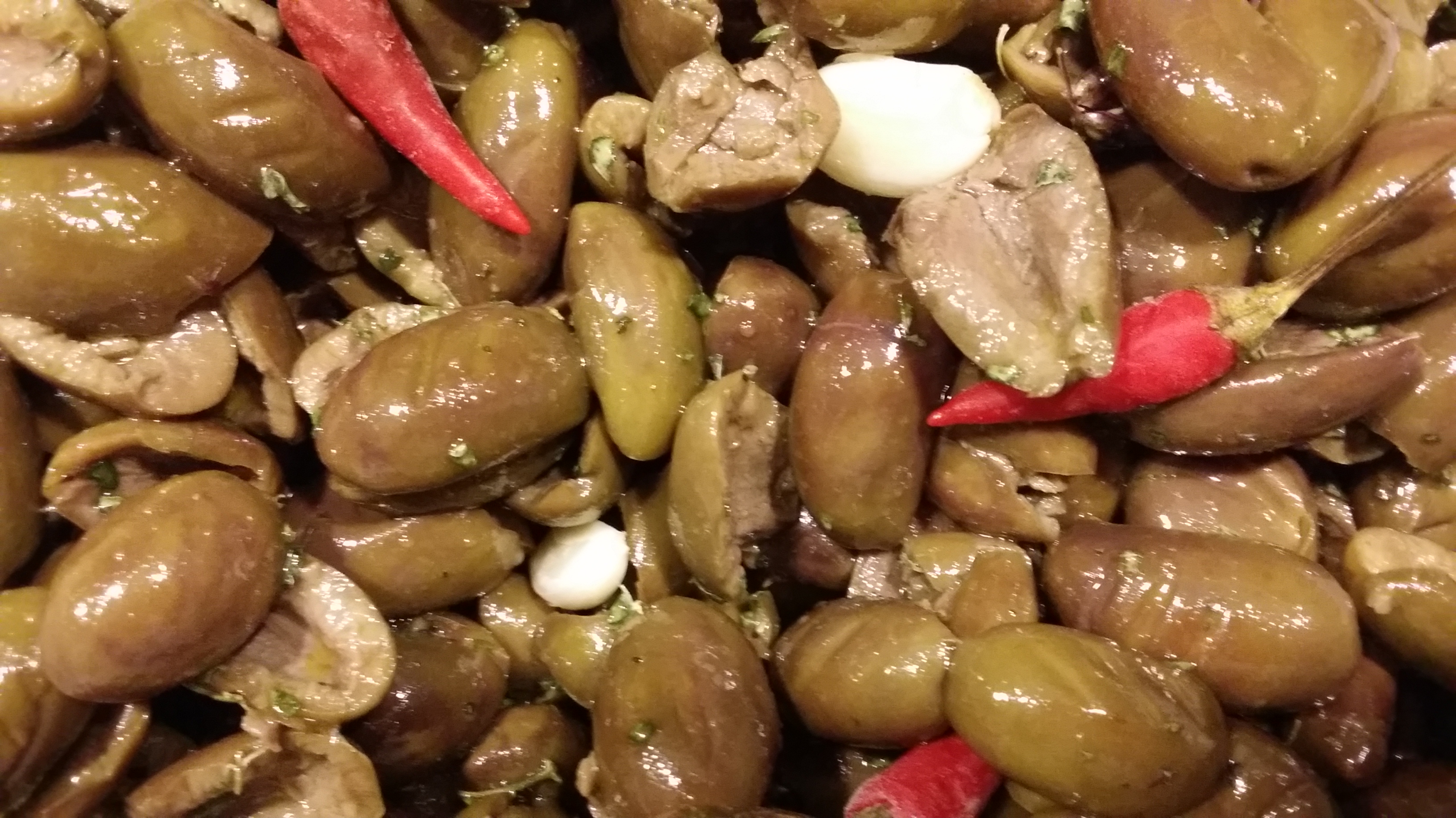 Schiacciate means split (or squashed) in Italian. Taking the effort to split the olives and remove the stone means that the bitter component of the olive will leach out in the changes of water needed more quickly. If you find that your 'smashing' technique isn't releasing the stone, don't panic. Just soak the olives (with the stones) and after the 3rd day, you can go through the olives again and manually take the stones out with your hands. They will come off more easily then.