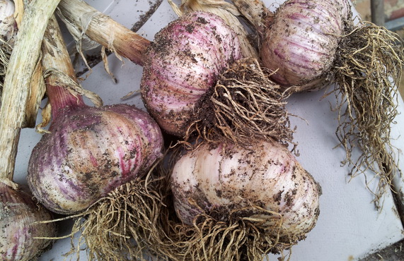 - Harden the garlic off in a sheltered sunny spot outside until the stalks and leaves have dried off. This may take a few weeks. When the leaves are dried, you can braid them in the traditional way and store in a cool, dry place (mine hang in the garage where they get a cross-breeze). The roots are best trimmed off so that they don’t act as a ‘wick’ for moist air and cause the garlic bulb to rot.