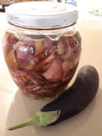 Place a thin layer of olive oil in to cover the base of the jars and add your eggplants to the jars with all of the other flavourings. As you do this, add olive oil to make sure all the layers of eggplant are coated in the oil. Once you've filled the jars, add more oil to cover the eggplants. Any bits left uncovered will quickly go mouldy. Store in a cool and dry place, but not in the fridge as the olive oil will go cloudy.